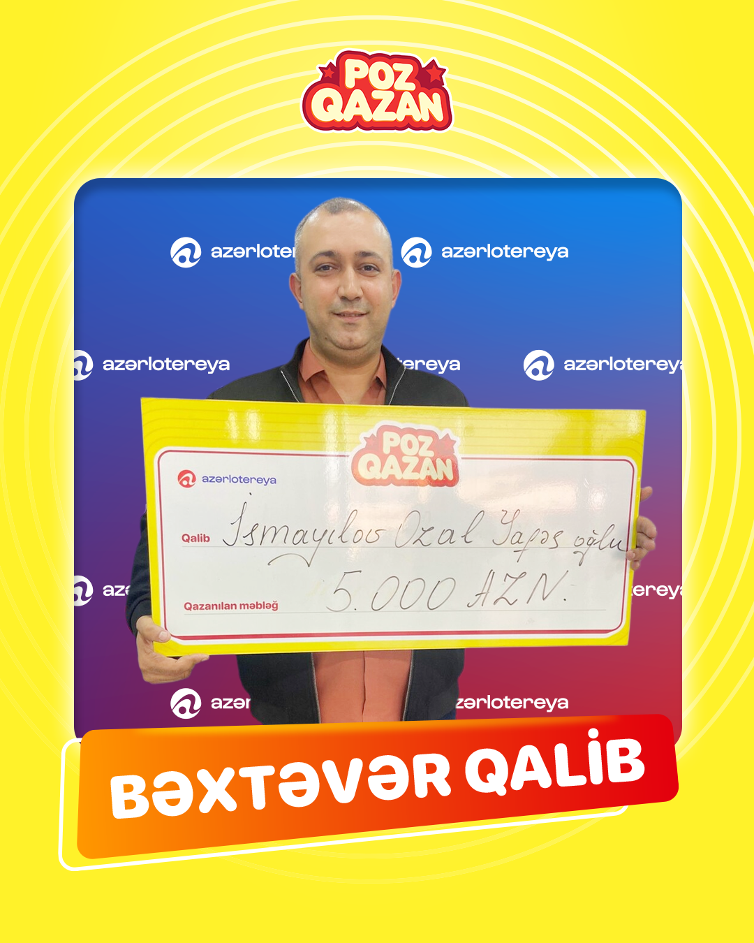 Gəncə sakini Ozal İsmayılov yeni satışa çıxan "Bəxt açarı" Poz-Qazan biletindən 5 000 manat qazanıb. Təbrik edirik.
