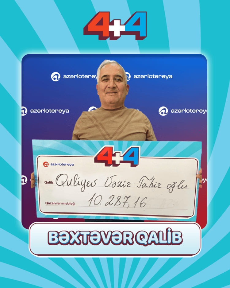 4+4 tirajlı lotereyasında cekpotu 1 rəqəmlə qaçıran Şəmkir şəhər sakini Vəzir Quliyev 10.287 manat qazanıb.